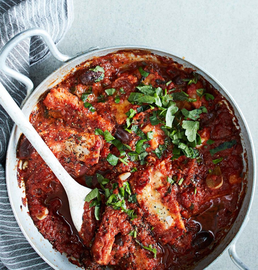 - Kaada pannulle tomaattimurska, sitruunamehu, sokeri ja suola. Kiehauta ja anna kiehua hiljalleen 10 minuuttia. Lisää joukkoon oliivit ja kala. Anna kypsyä 5-10 minuuttia. Mausta tarvittaessa suolalla ja sokerilla. Lisää lopuksi minttu, persilja ja mustapippuria. Tarjoile täysjyväriisin tai maalaisleivän kanssa.