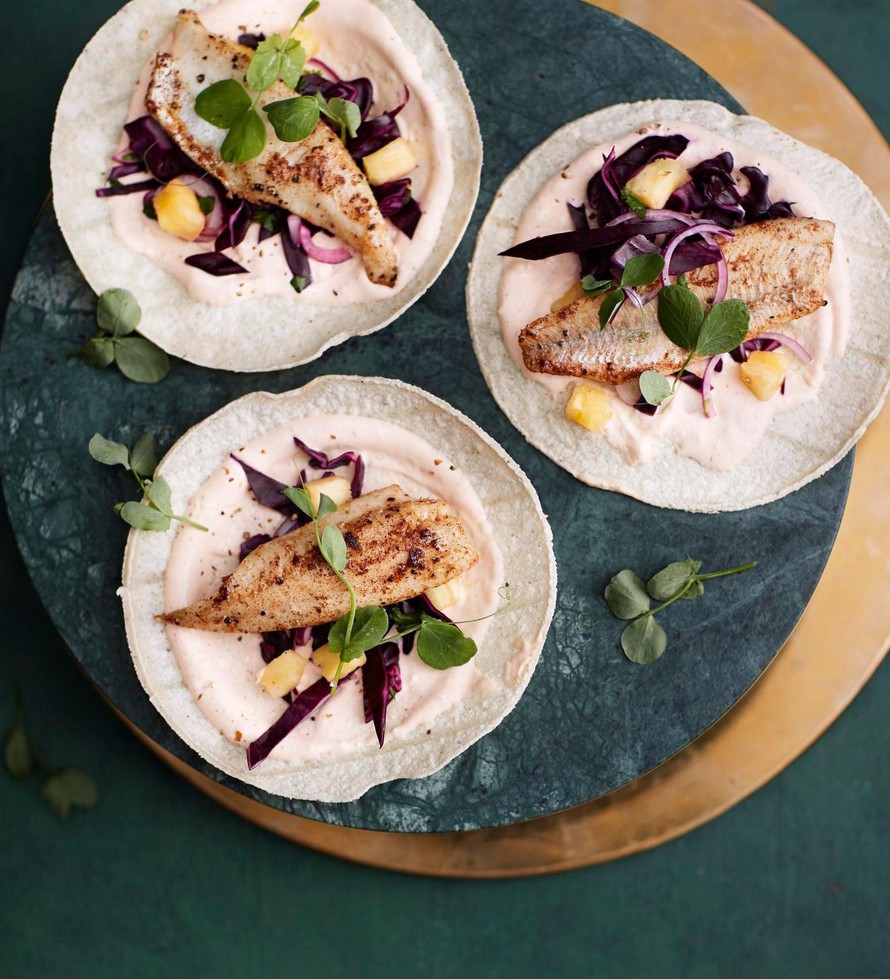 Lämmitä tortillaletut nopeasti kuivalla pannulla ja täytä kalalla, ananasslaw’lla, kastikkeella ja fetalla.