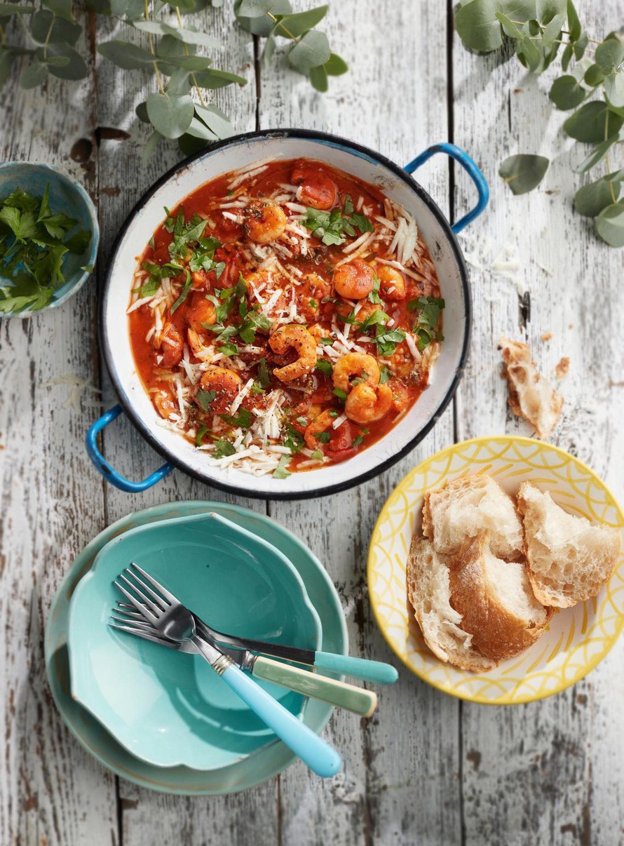Katkarapu-saganaki on kreikkalainen klassikko. Tomaattinen katkarapupannu valmistuu nopeasti liedellä tai kesäkeittiössä avotulella.
