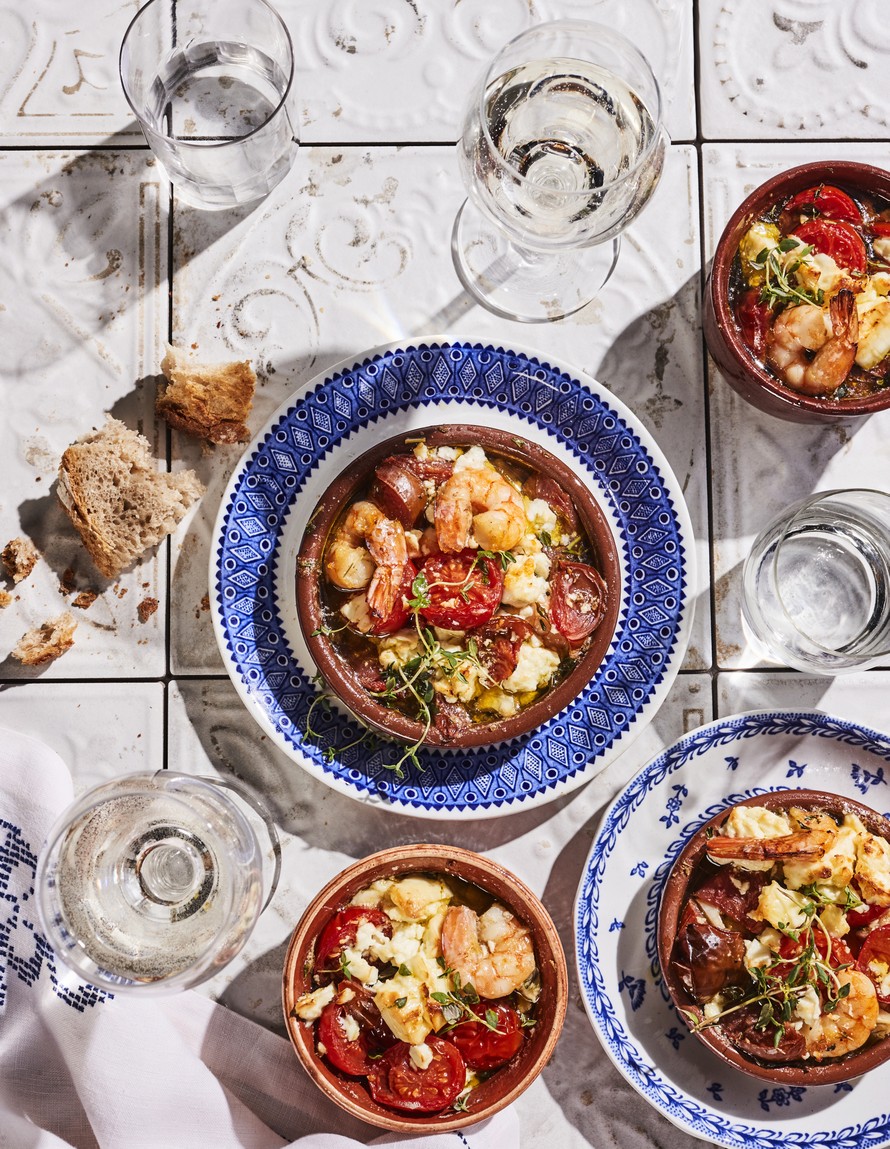 - Lusikoi katkaravunpyrstöt marinadeineen neljään uuninkestävään annosvuokaan. Lisää valkosipulit, hienonnettu timjami ja tomaatit. Mausta sokerilla ja suolalla. Valuta päälle reippaasti öljyä. Murustele päälle fetajuustoa.