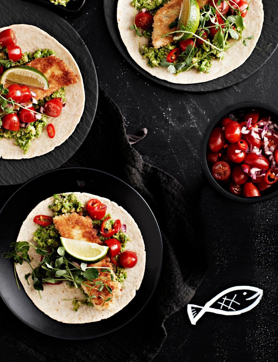 Kokoa. Levitä lettujen päälle guacamolea, salsaa, kuhapihvit, herneenversoja ja purista limetin mehua.