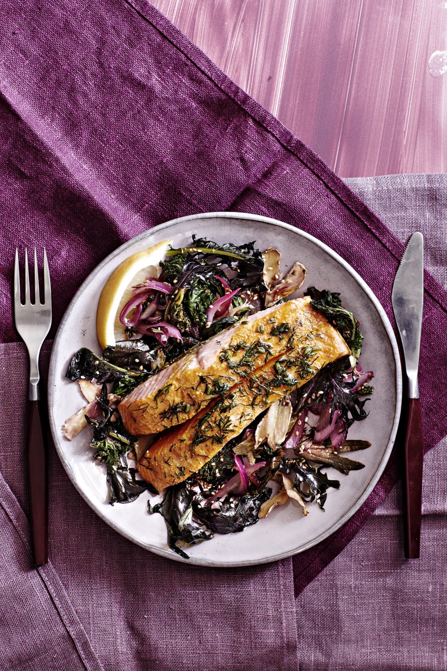 Kypsennä lohipalat lempeästi uunissa inkiväärillä maustetun lehtikaalipaistoksen päällä.