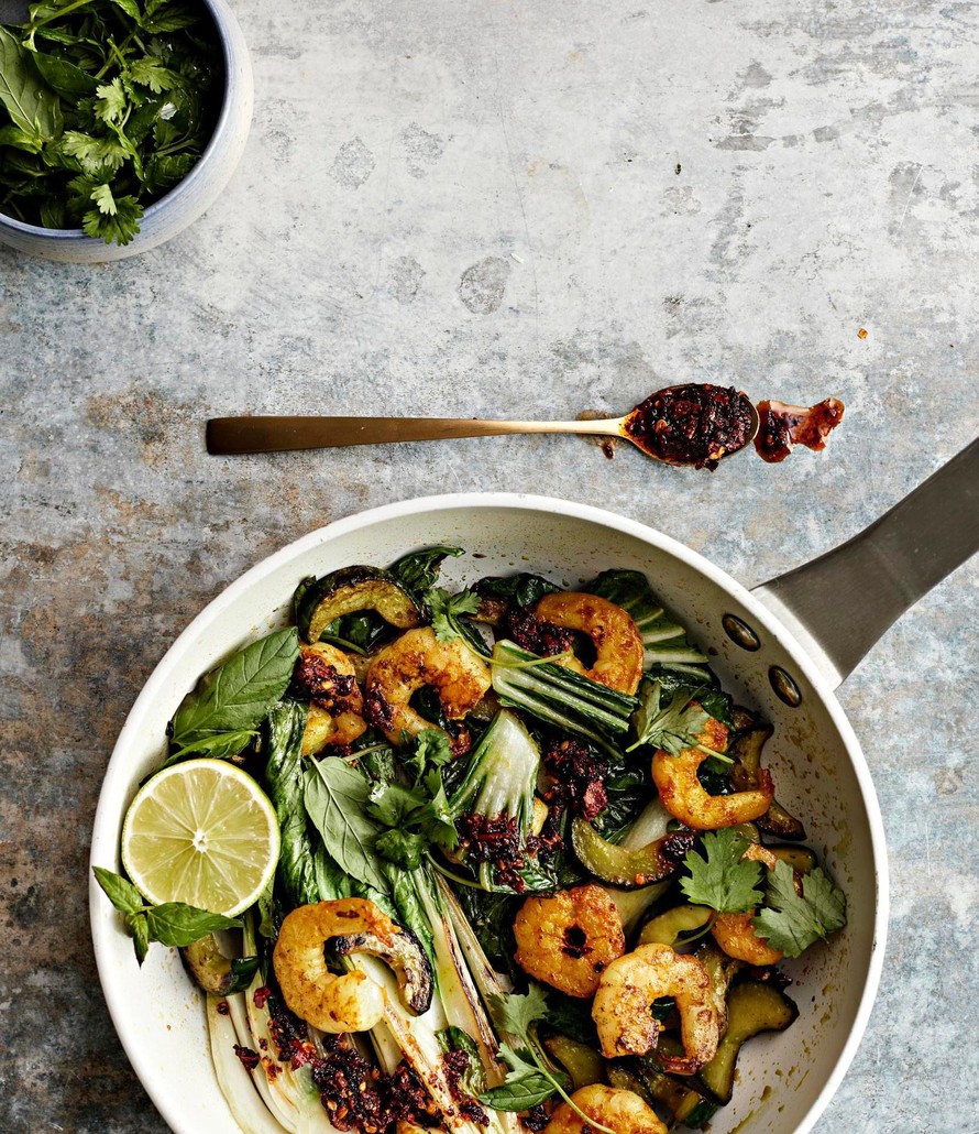 Pak choin ja kurkun joukkoon lisätään reilusti tuoreita yrttejä sekä kurkumalla maustettuja kuumaksi paistettuja jättikatkaravunpyrstöjä.