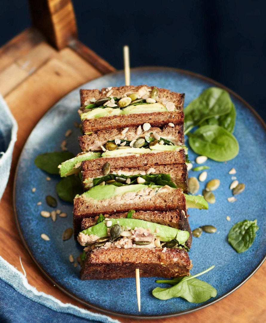 Voitele puolet leivistä avokadososeelle ja puolet sinapilla. Ripottele sinapilla voidel- luille leiville puolet juustosta. Lusikoi päälle pinaattipaistos ja tonnikala. Levittele avokado-siivut täytteen päälle ja lisää loput juustosta. Nosta avokadolla voidellut leivät kanneksi.