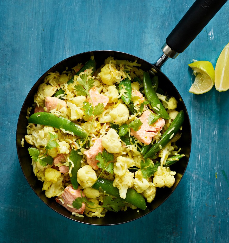 Maukkaasta yhden astian ruuasta löytyy meheviä lohipaloja, rouskuvia sokeriherneitä, kukkakaalinnuppuja ja riisiä. Lisää lohipalat pannulle vasta loppuvaiheessa, jotta ne pysyvät ehjinä.
