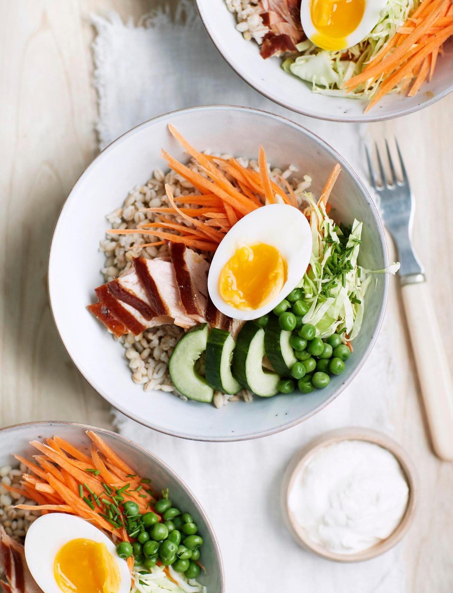 Suomi-bowl eli muodikas kulhoruoka syntyy ohrasta, kalasta, munista sekä rapsakasta porkkanasta ja kaalista.