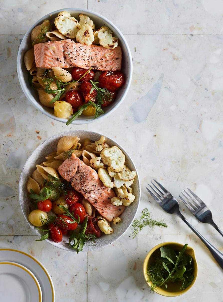 Keitä pasta kypsäksi suolalla maustetussa vedessä. Sekoita valutettu pasta paahdettujen kukkakaalien ja tomaattien joukkoon yhdessä rucolan ja tillinoksien kanssa. Lusikoi pastaseos kulhoihin ja nosta lohipalat annosten päälle.