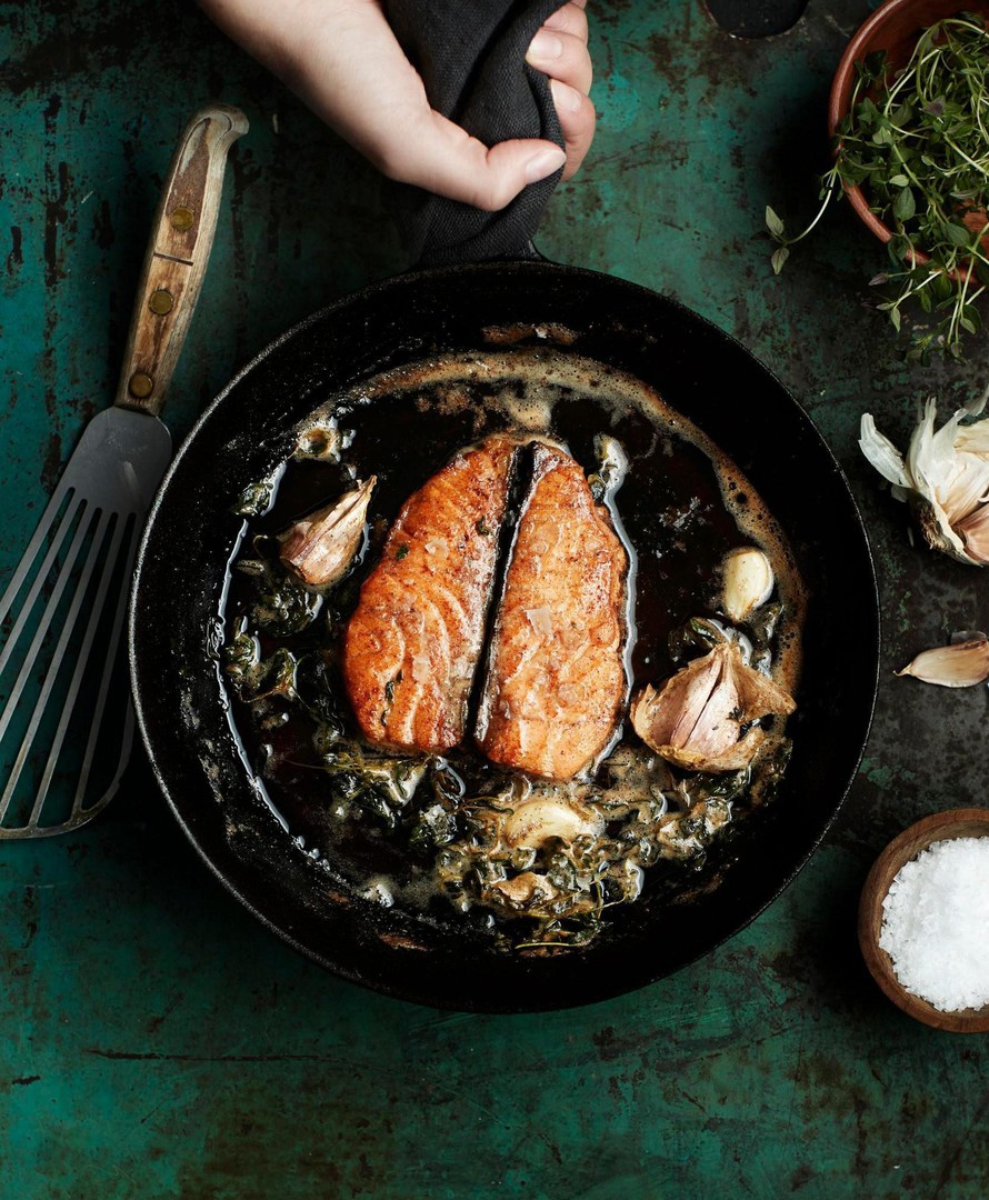 Kun lohen pinta on kauniin ruskea, käännä medaljongit ja paista toiselta puolelta korkeintaan minuutti. Valele kalaa voilla paiston aikana.