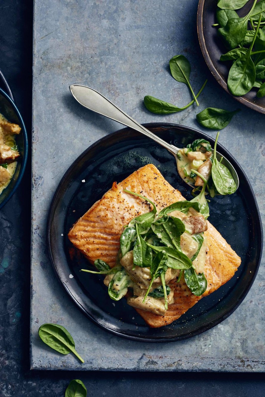 Lohta ja kermaista sieni-pinaattikastiketta