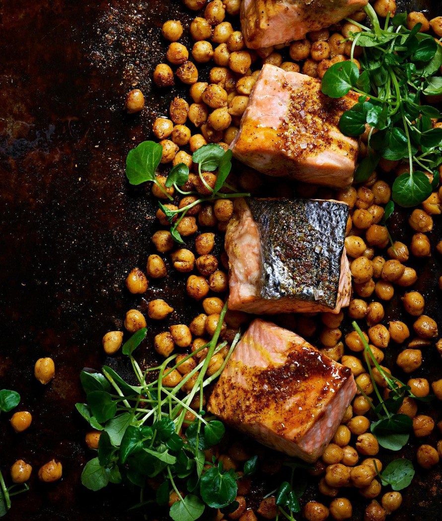 Kaada kuuma maustevoi suoraan lohen ja kikherneiden päälle. Tarjoa heti rucolan tai vesikrassin (ja runsaan salaatin) kanssa.
