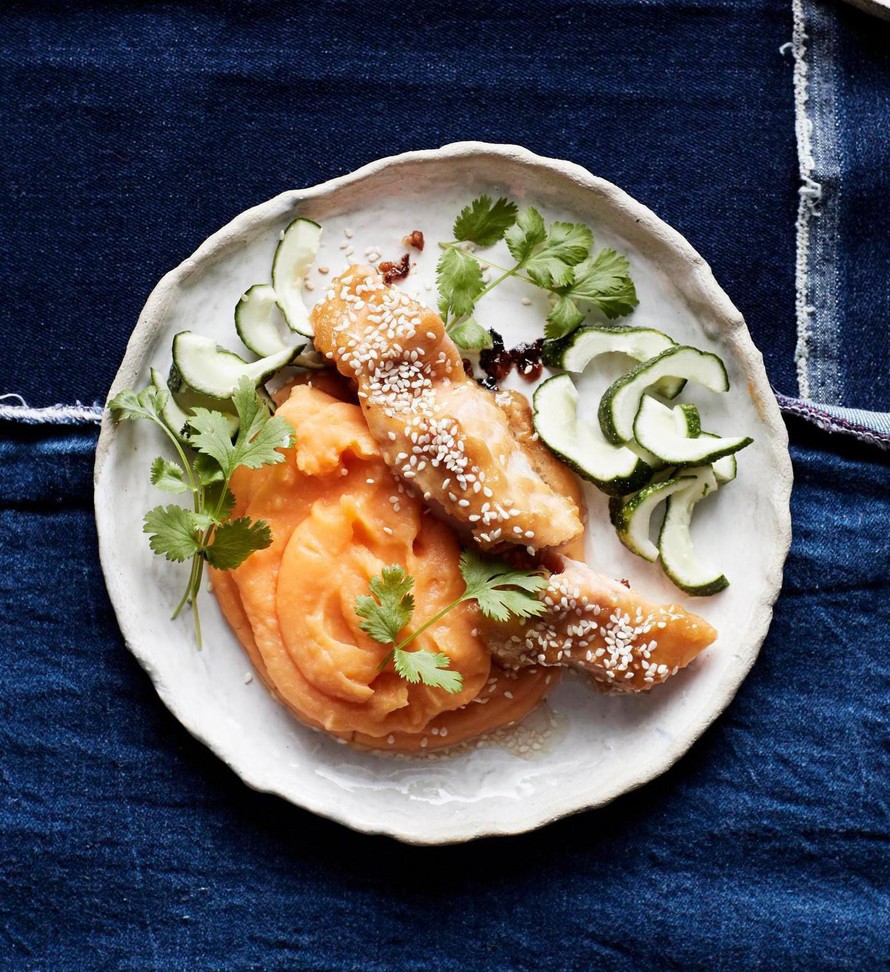 Lämmitä sillä aikaa bataattimuusi pakkauksen ohjeen mukaan. Mausta inkiväärillä. Tarjoa halutessasi lisänä kurkkuviipaleita, joiden päälle on ripoteltu seesaminsiemeniä.