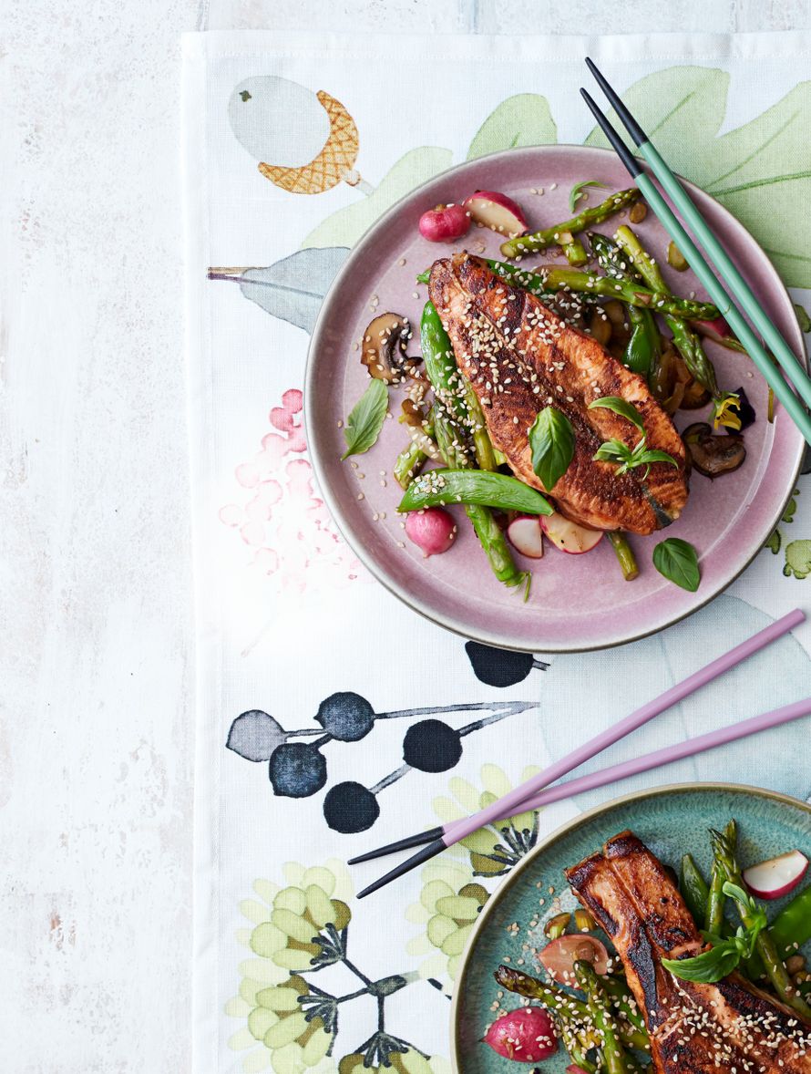 Misomarinadiin upotettu lohi maistuu paistettuna ihanalta rapeiden kesäkasvisten seurassa. Voit käyttää kesäkasvisvokkiin mitä tahansa saatavilla olevia kasviksia. Alkukesällä vokissa maistuvat parsat ja retiisit.