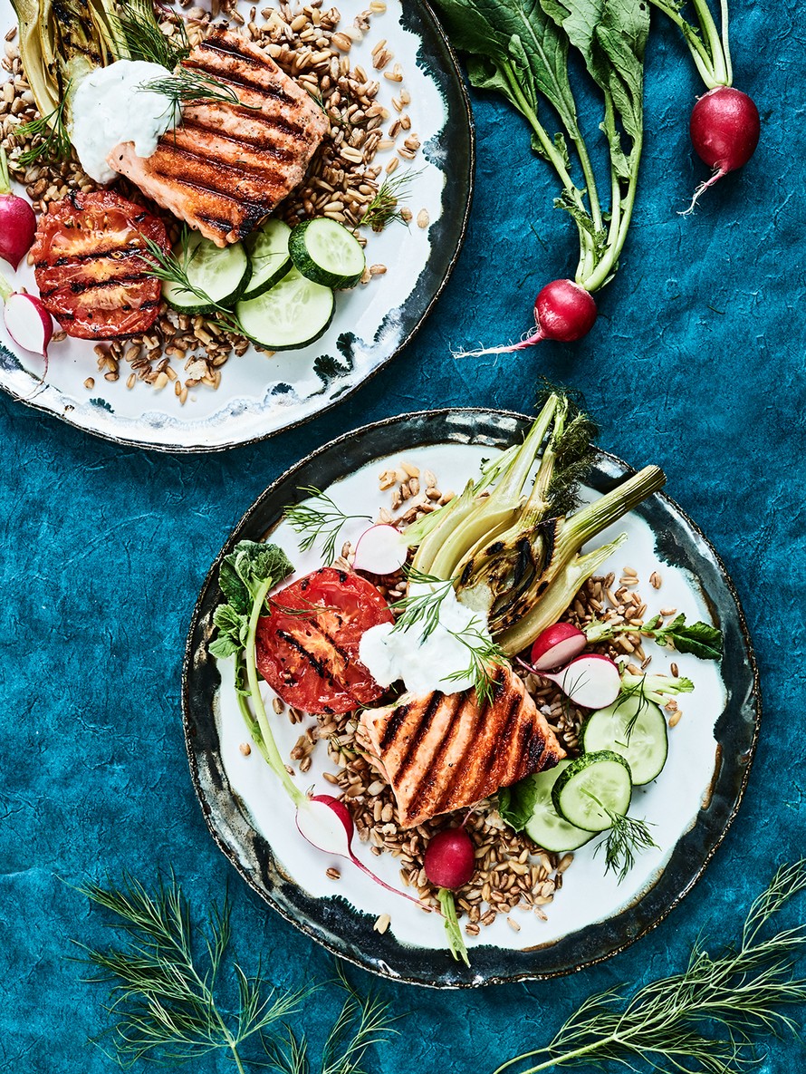 Parila paahtaa lohelle kunnon raidat! Mehevä kalapala kootaan ruokaisaksi annokseksi jyvien ja vihannesten kanssa. Kokonaisuus viimeistellään kukkakaali-jogurttisoosilla.