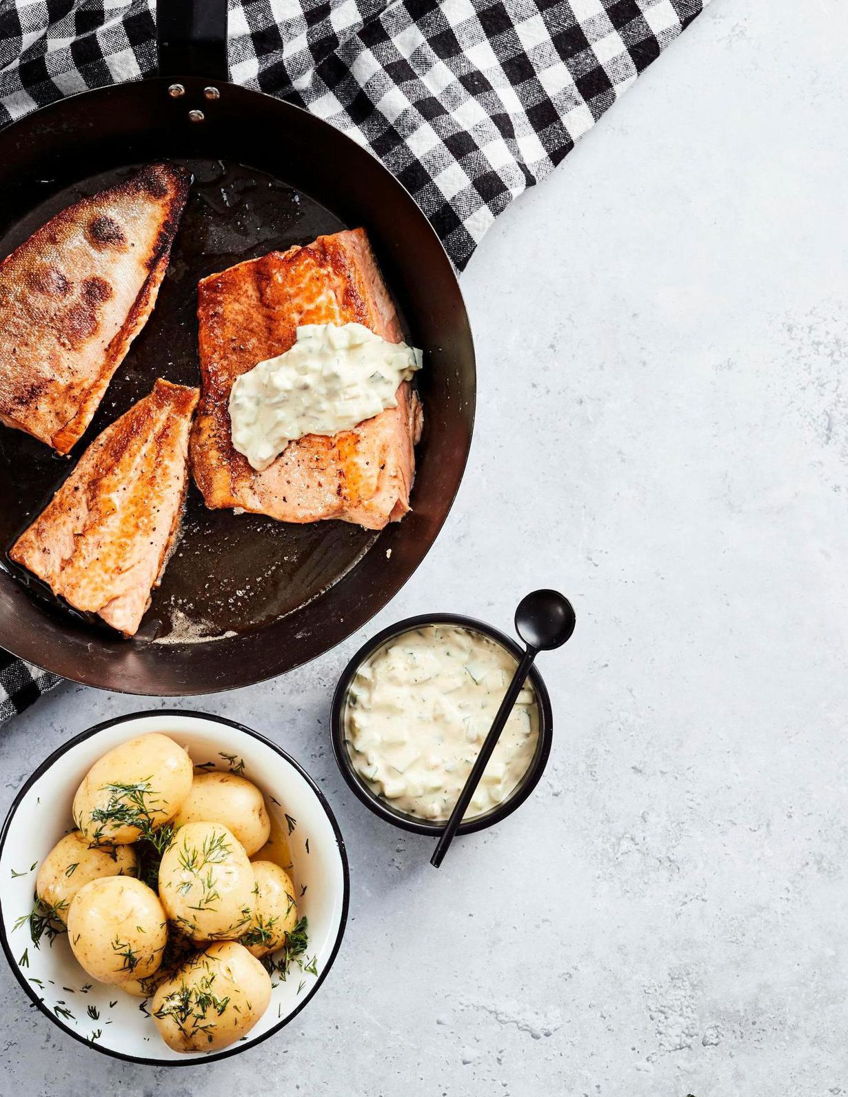 Raikkaankirpeä kapris-kurkkumajoneesi on mainiota seuraa paistetulle kalalle. Nieriän sijaan pannulle sopii vaikkapa kirjolohi tai siikakin.