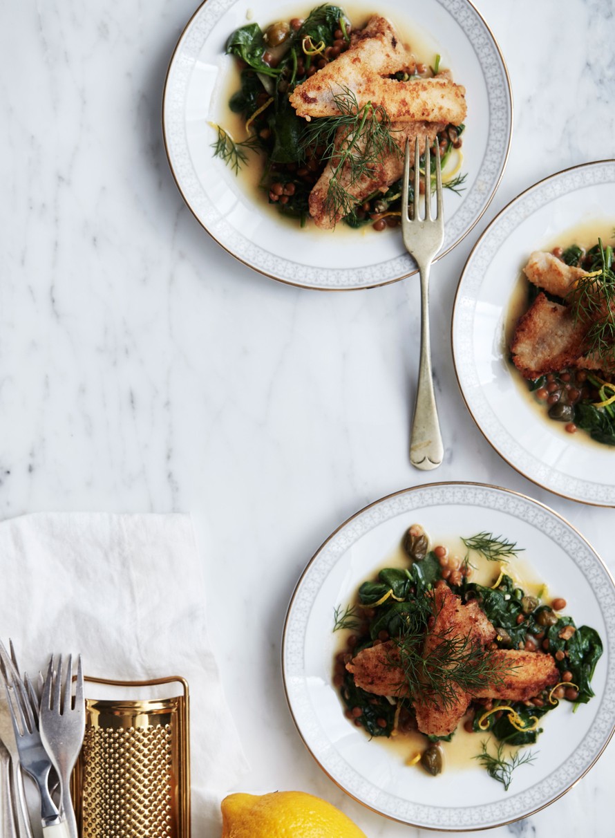 Kapriksilla, tillillä ja sitruunalla höystetty linssipannu on ihana seuralainen ruskistetussa voissa paistetuille ahvenille.