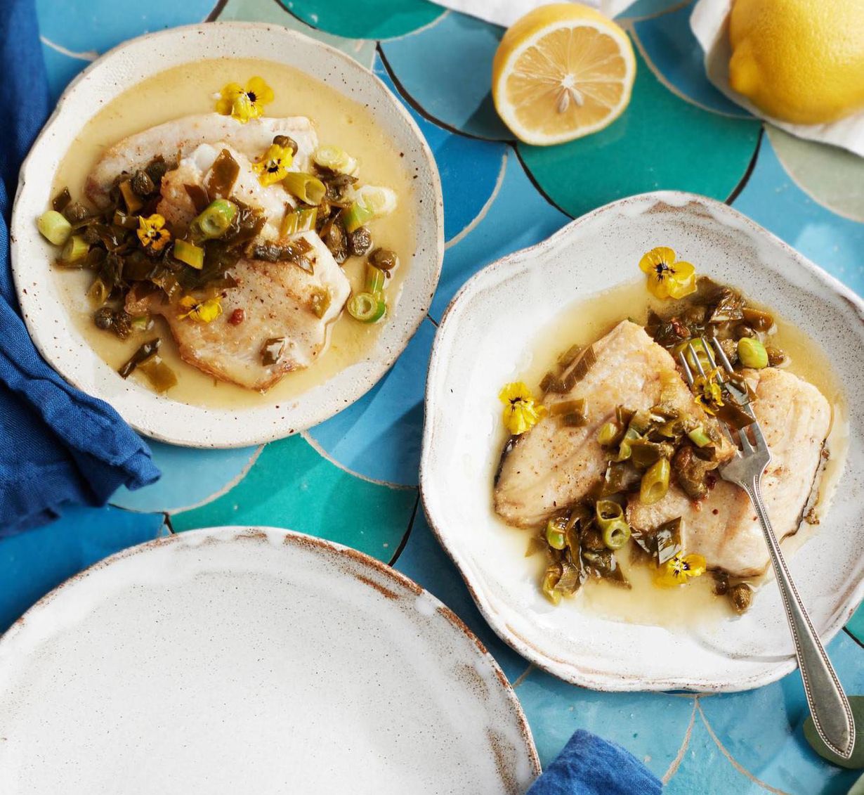 Raikas ahven- tai siika-annos on kuin suoraan Kreikan saaristosta. Kala ja kastike valmistuvat nopeasti samalla pannulla. Keitä lisäksi uusia perunoita.