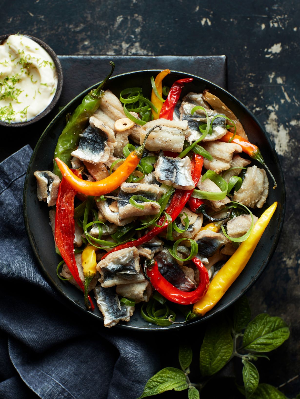 Pienet silakkapalat pullistuvat kuumassa öljyssä meheviksi herkkupaloiksi samalla kun chilin maku pehmenee. Itse tehty majoneesi maustetaan limetillä.