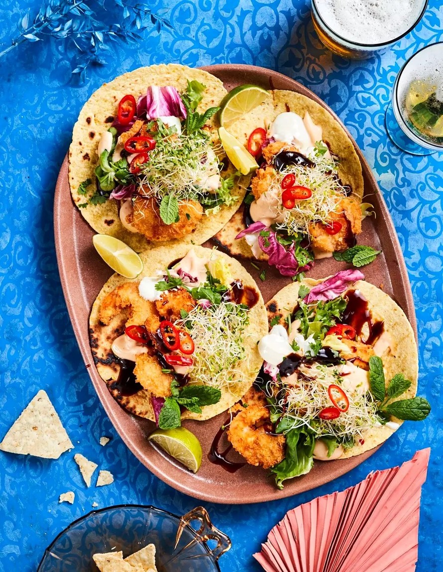 Lämmitä tortilloja uunissa muutaman minuutin. Kokoa tacot levittämällä tortilloille chili-seesamimajoneesia, hoisin-kastiketta, salaattisekoitusta, hunajajogurttia, rapeita jättikatkaravunpyrstöjä ja vielä majoneesia ja hoisin-kastiketta.