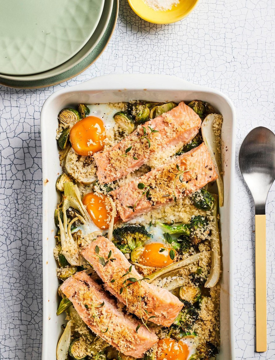 Nosta vuoka uunista ja riko kananmunat lohipalojen väleihin, kasvisten päälle. Ripottele pankojauhoseos kalapalojen päälle. Laita vuoka takaisin uuniin noin 7–8 minuutiksi tai kunnes valkuainen on hyytynyt. Mausta munat ripauksella suolaa.