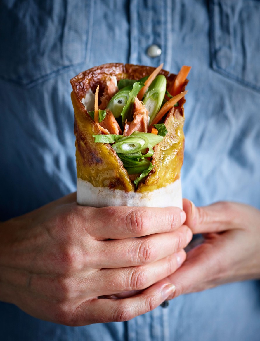 - Levitä wasabimajoneesia letuille ja täytä letut tämän jälkeen lohella ja kasviksilla. Taita letun yksi reuna keskustaa kohden pohjaksi ja rullaa lettu kiinni.