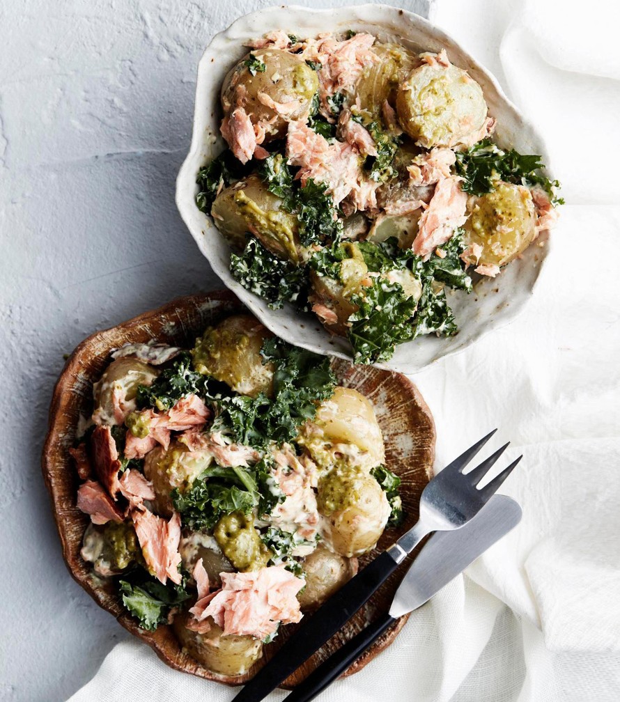 Tätä ruokaa voisi kutsua kalaisaksi perunasalaatiksi tai ihan vain savukala-perunapöperöksi. Keitetyt perunat sekoitetaan nimittäin pestosta ja ranskankermasta tehtyyn kastikkeeseen ja mukaan lisätään savukalan paloja sekä hieman lehtikaalia.