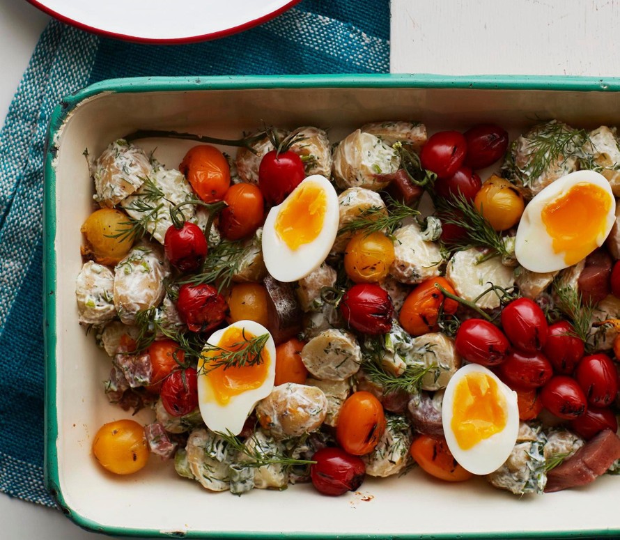 Uudet perunat, silli ja tillinippu ovat kesäkeittiön perusaineksia, joista syntyy ihanan suolainen pottusalaatti. Nopeasti grillissä käyneet tomaatit tuovat lisää kesän makua.