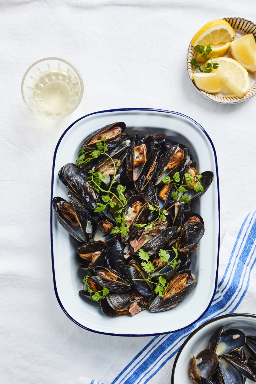 Pekoni, siideri ja tuore kirveli höystävät sinisimpukat, jotka ovat aitoa pikaruokaa. Osta valmiiksi puhdistettuja simpukoita, jos haluat päästä pöydän ääreen jopa vartissa.