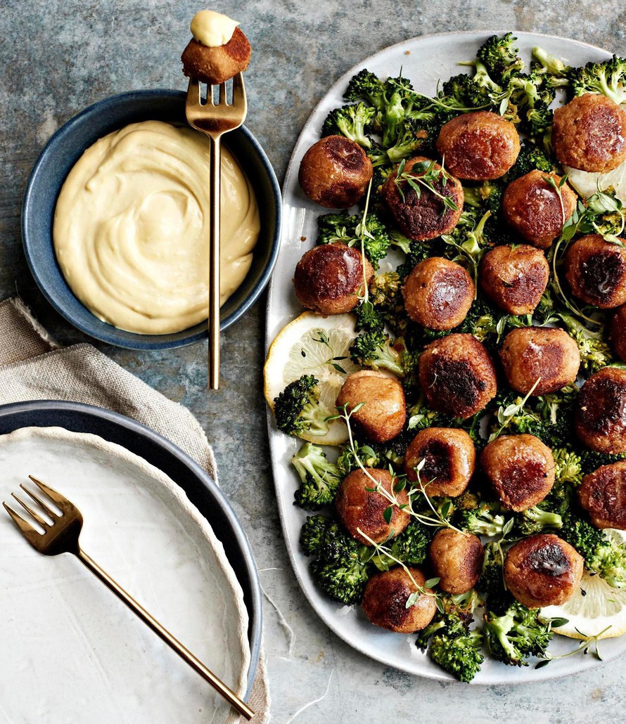 Säilykkeestä tehtävät kalapullat maistuvat pikapaistettujen parsakaalinnuppujen ja sitruunamajon kanssa. Valkuaisista vatkattu vaahto pitää pullien rakenteen ilmavana.