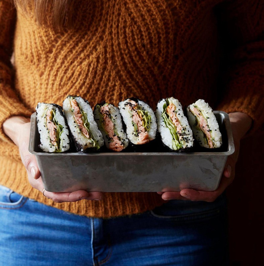 Onigirazujen eli kolmioleipää muistuttavien sushikääröjen täytteeksi käyvät savulohen lisäksi katkaravut tai paistettu kananmuna.