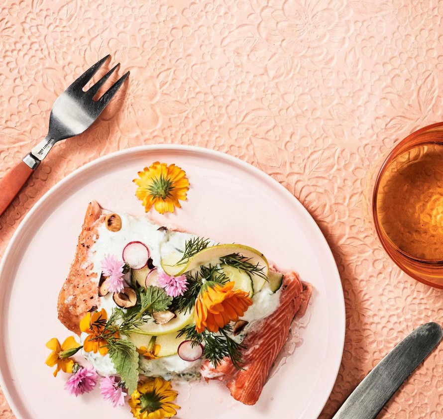 Lusikoi kypsälle lohelle tsatsikia. Levitä päälle omena-, kurkku- ja retiisiviipaleet. Lisää vielä pähkinärouhetta, tilliä ja sitruunamelissaa. Voit koristella annoksen juhlakuntoon kukilla.