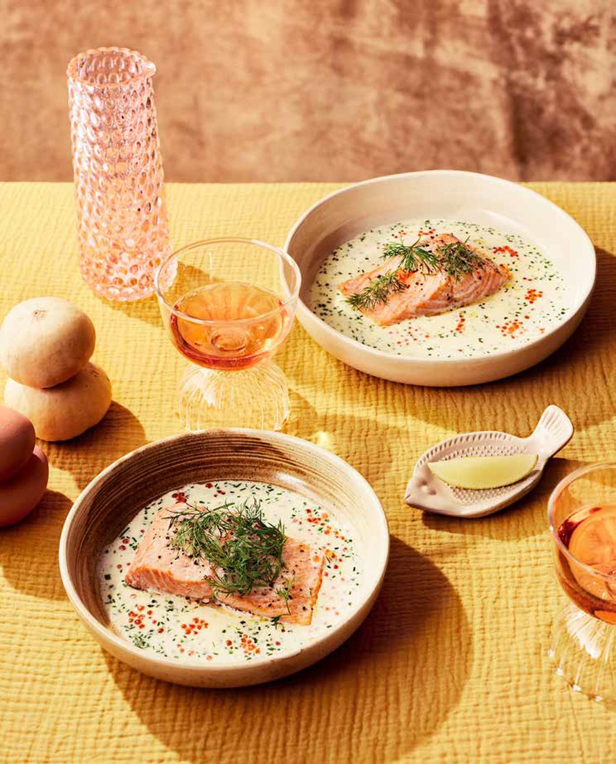 Lusikoi kastike lautasille. Jaa loppu mäti kastikkeen päälle. Paloittele lohi ja nosta palat lautasille. Viimeistele tillillä ja sitruunan kuoriraasteella.