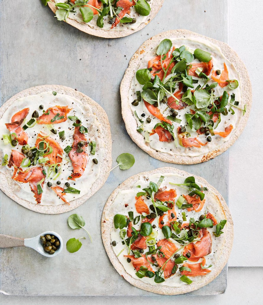Ricottajuuston kanssa tortillapizzojen täytteeksi tulee kylmäsavulohta, kapriksia sekä kevätsipulia. Tortillapizzat ovat myös loistava tapa ehkäistä hävikkiä, sillä pizzan täytteitä voi varioida kaappien sisältöjen mukaan.