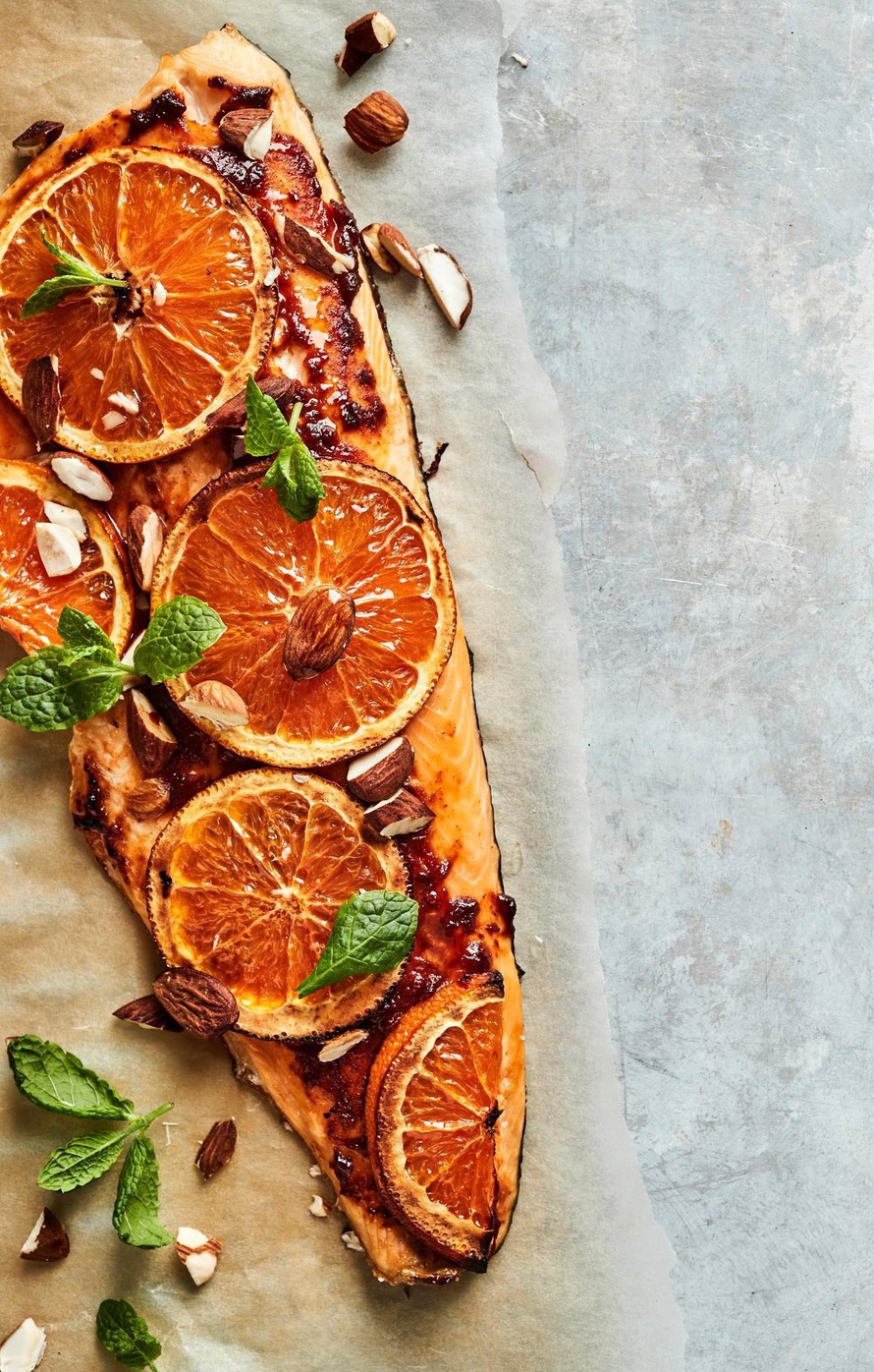 Harissatahna, rouhitut mantelit ja raikas veriappelsiini kruunaavat uunikalan.