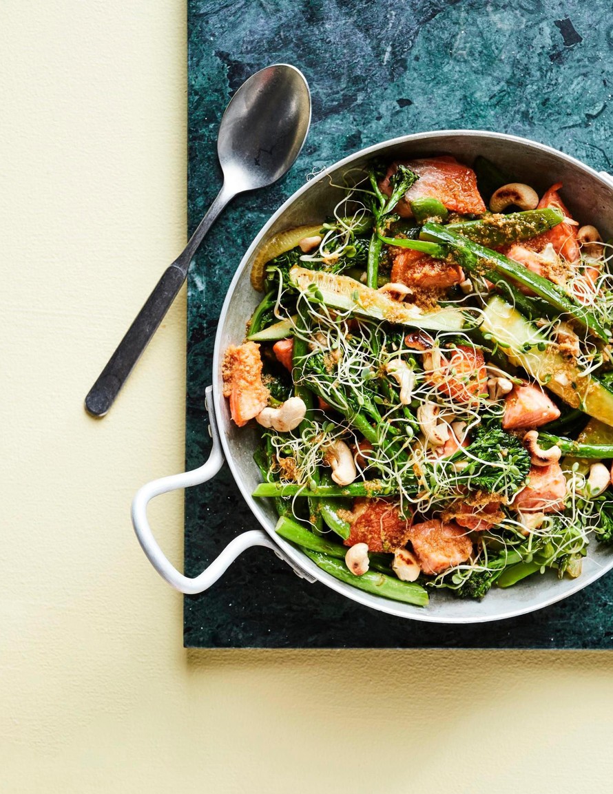 Paahda pähkinöitä kuivalla, kuumalla pannulla koko ajan sekoittaen, kunnes ne ovat vähän ruskistuneet. Siirrä pähkinät syrjään pannulta ja paista seuraavaksi lohikuutiot tilkassa öljyä kypsiksi. Mausta lohikuutiot suolalla. Siirrä lohikuutiot syrjään pannulta ja paista broccoliinejä, kevätsipulia, kurkkutikkuja ja sokeriherneitä tilkassa öljyä 3–4 minuuttia. Kasvikset saavat jäädä napakoiksi.