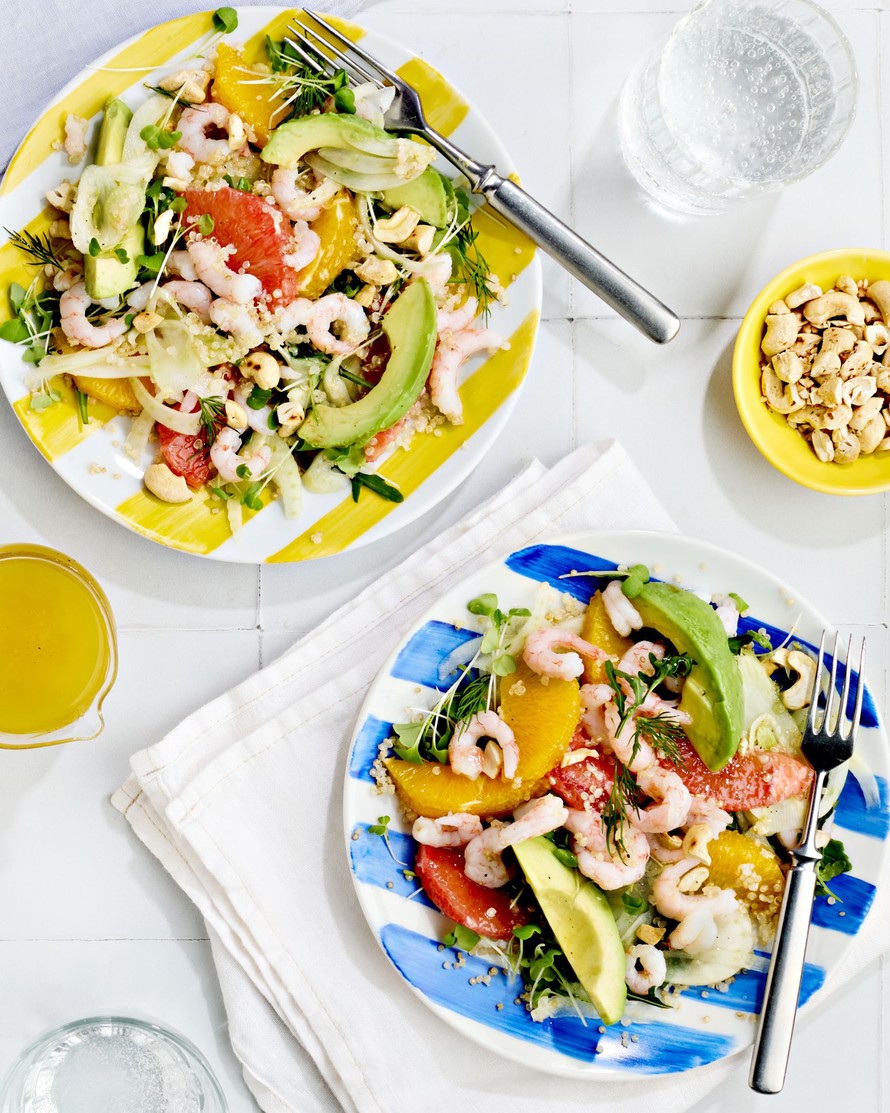 Katkarapu–sitrussalaatti yhdistää mehukkaat appelsiinit ja verigreipit, pehmeän avokadon sekä rouskuvan fenkolin. Kvinoa ja pähkinät tuovat salaattiin ruokaisuutta, kun taas sitruunavinegretti viimeistelee kokonaisuuden kepeän kirpeällä sävyllä.