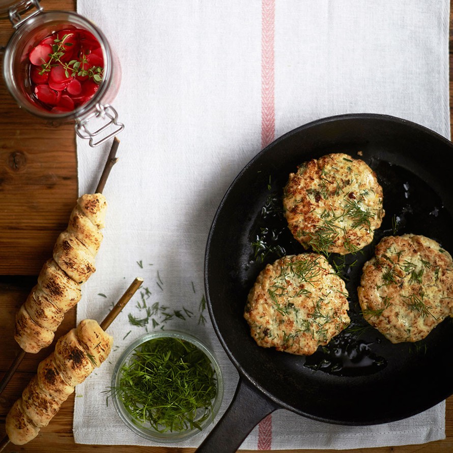 - Hienonna tilli ja timjami. Sekoita yrtit kalamassaan. Mausta mureketaikina lopuksi suolalla ja pippurilla ja sekoita tasaiseksi.