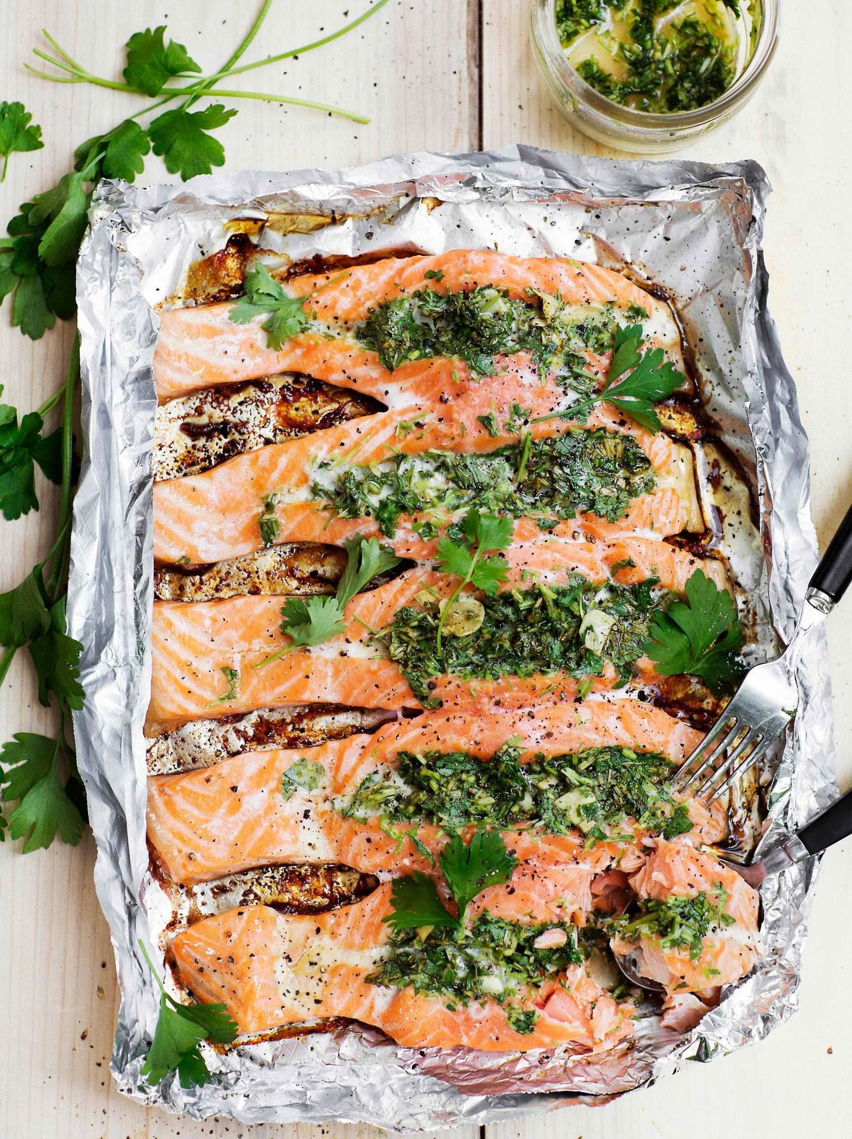 Marokkolainen chermoula-kastike on täydellinen kaveri grillatulle kalalle. Se toimii myös ihanana täytteenä: leikkaa lohipaloihin viillot, lusikoi niihin chermoulaa ja sujauta grilliin.
