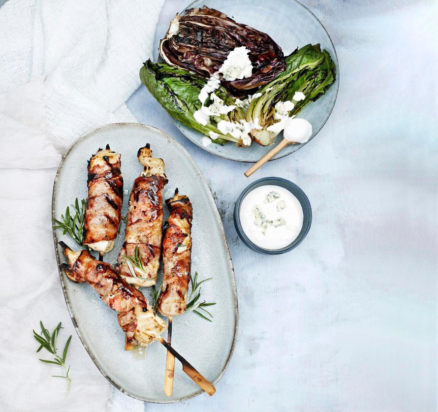 Kuumat haukivartaat, grillattu salaatti ja kylmä kastike ovat taivaallinen trio.