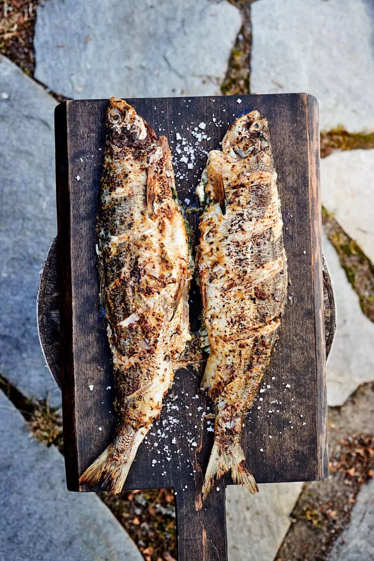 Sivele täysjyväsinapista, sitruunasta ja ruohosipulista tehtyä marinadia siioille ahkerasti kypsentämisen aikana pitkävartisella sudilla. Öljyinen marinadi maustaa ja pitää kalan mehevänä.