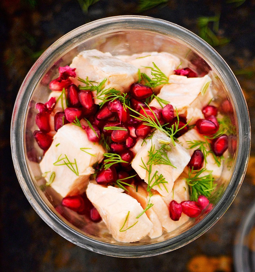 - Halkaise granaattiomena ja irrota siemenet. Hienonna tilli. Nosta lohipalat liemestä tarjoiluastiaan ja lisää siemenet ja tilli. Ripottele sormisuolaa päälle. Halutessasi lisää hieman raastettua sitruunankuorta.