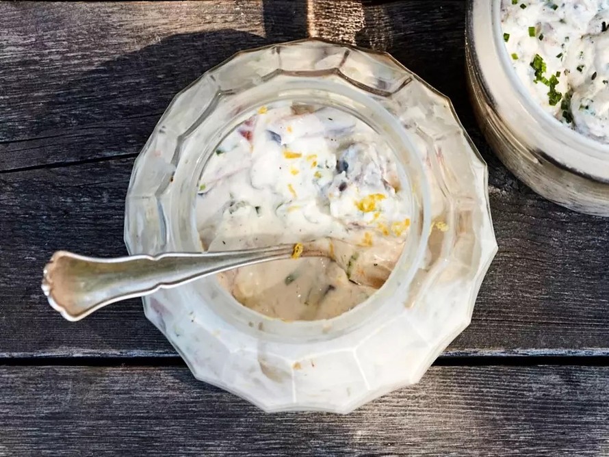 - Hienonna kesäsipuli varsineen ja lisää joukkoon. Raasta sekaan sitruunan kuori ja purista puolikkaan mehu.
