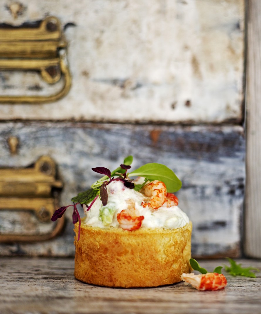 Mitä syntyy, kun yhdistää kaksi klassikkoleipää, tanskalaisen skagenin ja ranskalaisen briossin? ”Leipäkori”, jonka täytteenä on raikasta ravuista, avokadosta ja piparjuuresta tehtyä salaattia. Rapujuhlien tyylikäs annos palkitsee vaivan.