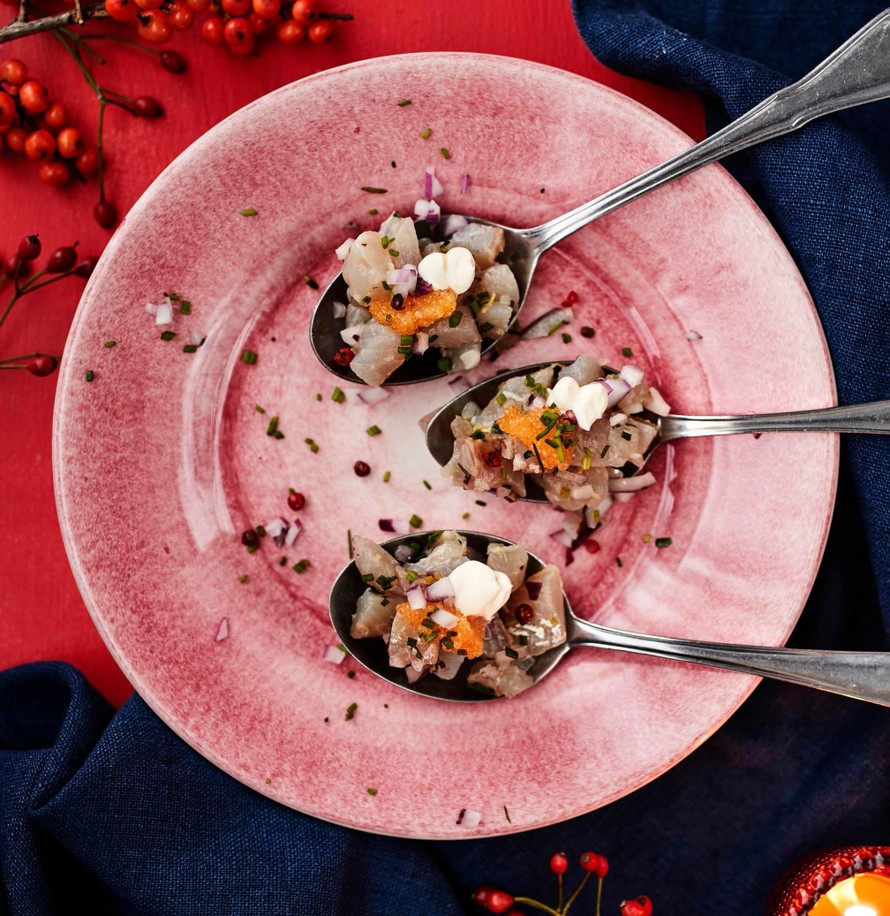 - Tarjoa kulhosta joulun alkuruokien kanssa tai jaa tartar ruokalusikoihin vadille. Viimeistele ruohosipulilla, roseepippurilla ja siianmädillä.