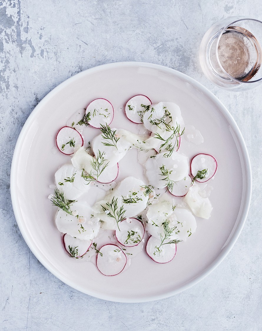 Hienostunut alkuruoka kampasimpukoista valmistuu vartissa. Makutriona simpukoiden seurassa toimivat tilli, retiisi ja gari.