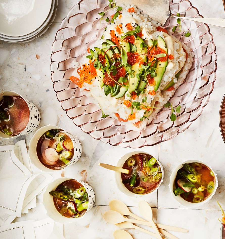 Levysushin riisin ja muut ainekset voi valmistella etukäteen, kasaaminen käy vikkelästi juuri ennen vieraisen saapumista.