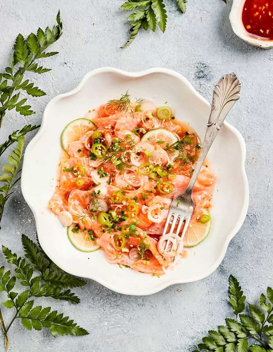 Ohueksi viipaloitu kala asetellaan tarjoiluvadille, ja päälle kaadetaan maukas kastike. Inkivääri, seesamiöljy ja riisiviinietikka siivittävät lohen poke-kulhoista tuttuun makumaailmaan.