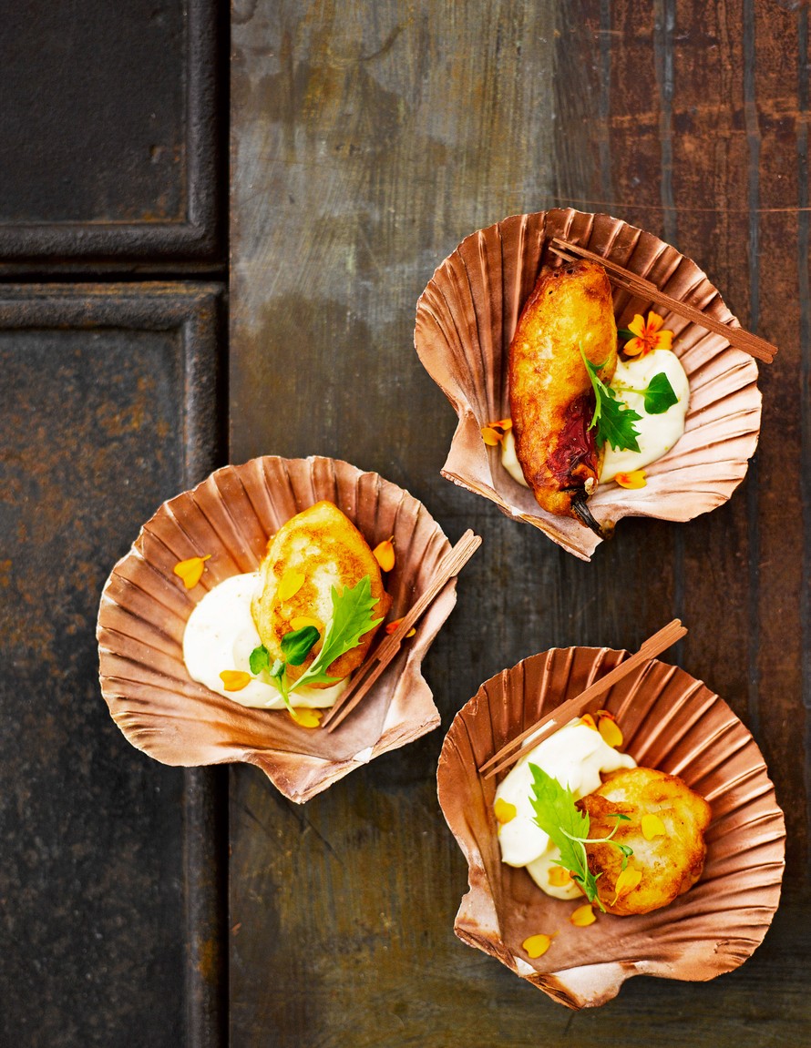 Oluttaikinalla kuorrutetut jalapenot ja kampasimpukat