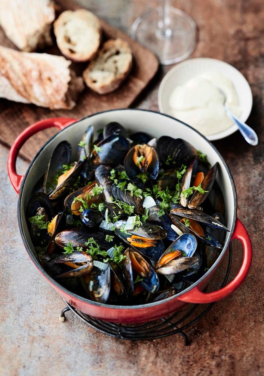 Valkoviiniliemessä haudutetut sinisimpukat kuuluvat kirjailija Kati Tervon lempipikaruokiin. Kauniissa padassa tarjottuna ne sopivat vaikka vierasruuaksi.