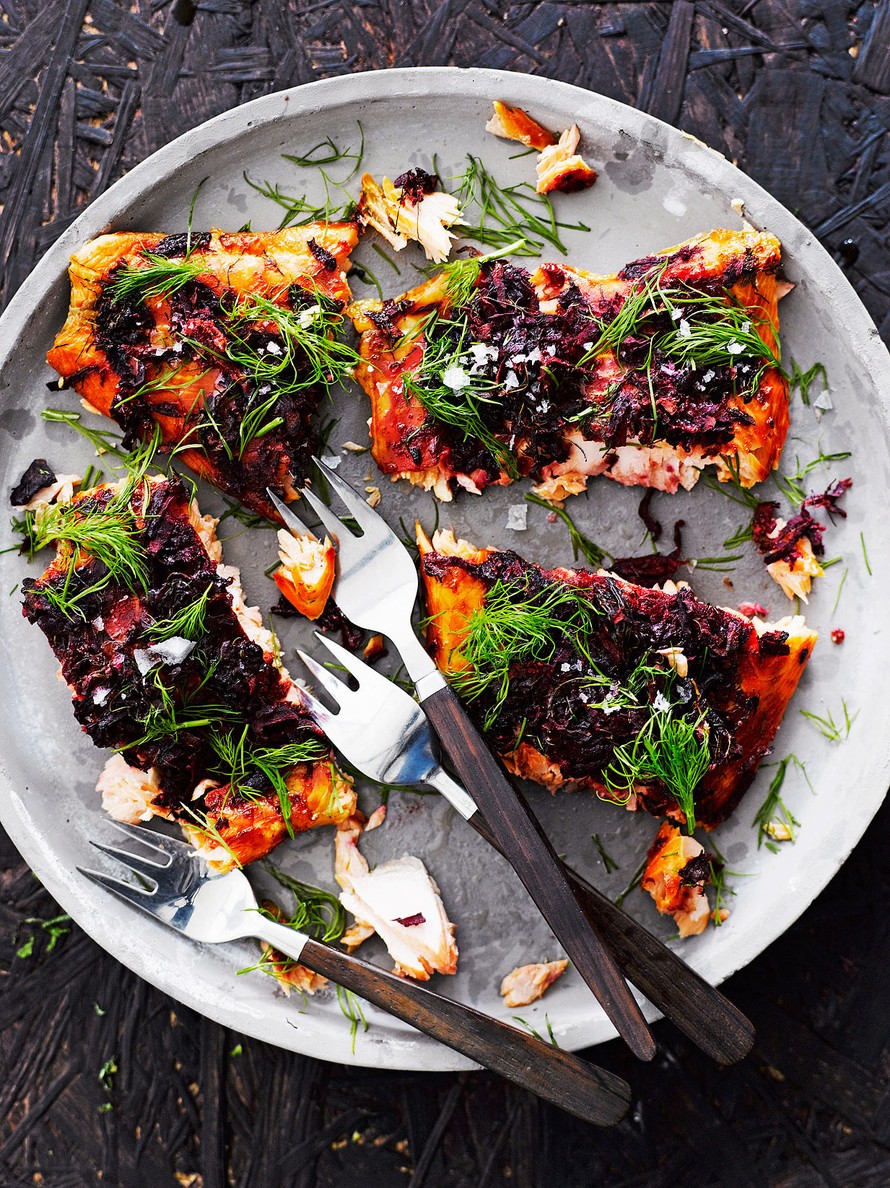 Graavaa lohi punajuurella ja kypsennä kevyesti uunissa.