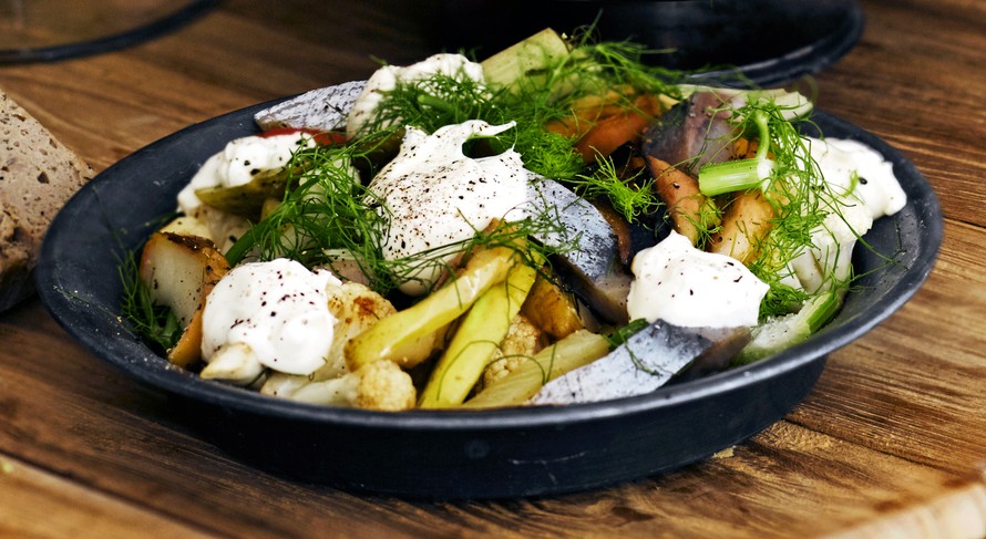 - Juuri ennen tarjoamista valuta kasvikset ja sekoita silli ja maustekurkku joukkoon. Nostele salaatti tarjoiluastiaan ja koristele notkistetulla ranskankermalla, fenkolinlehdillä ja tillillä.